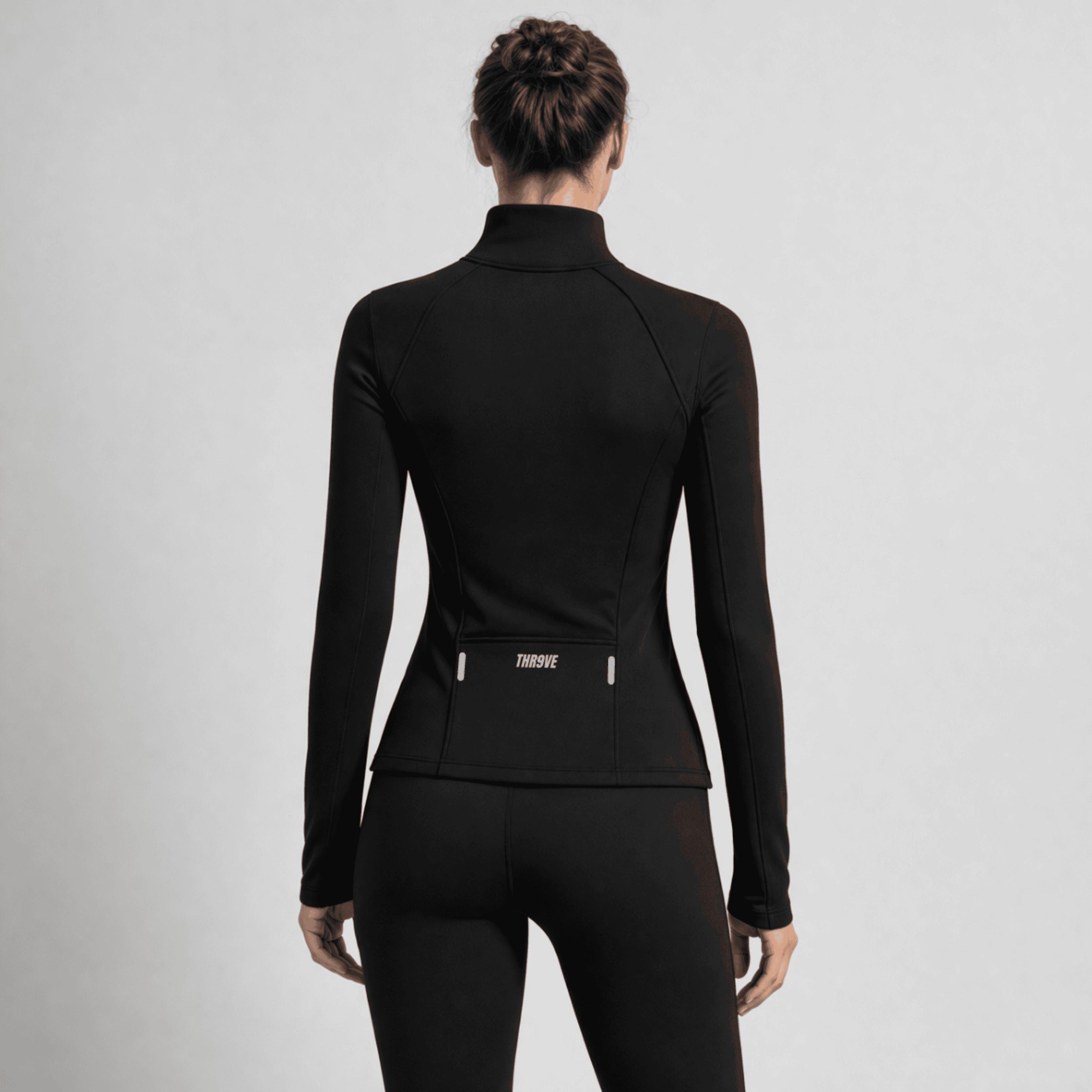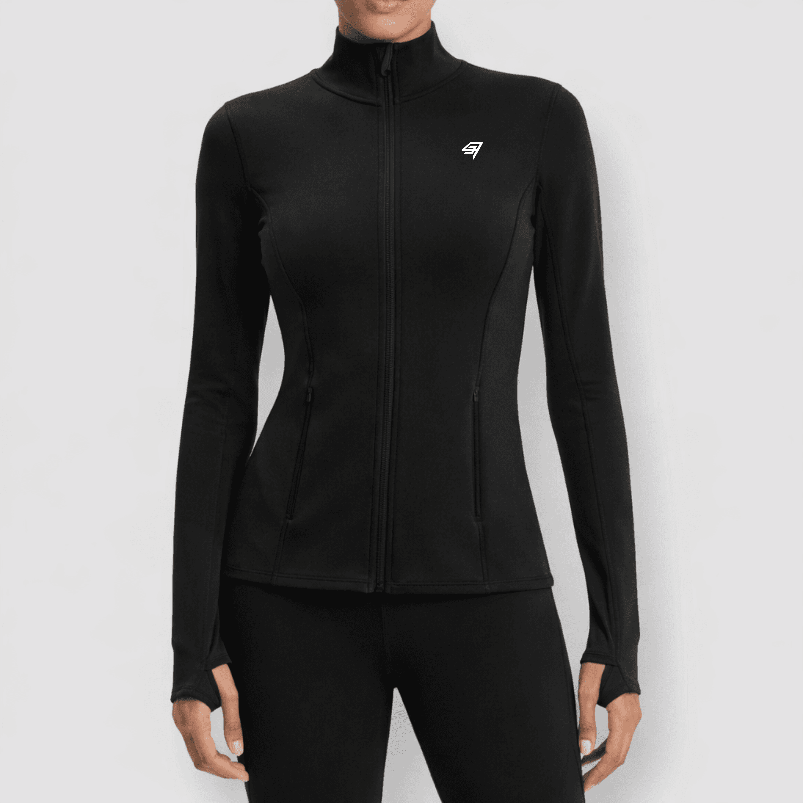 Built for performance. Refined for movement. A sculpting half-zip jacket with breathable stretch, thumbholes, and secure storage.